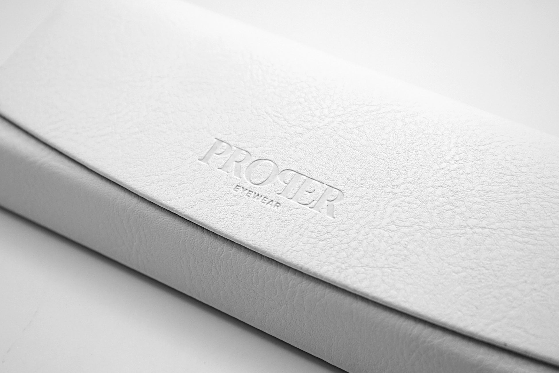 Procter Eyewear – White Leather Hard Case with Velvet Box and cleaning cloth.